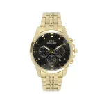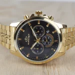 مدل 2084G: موتور ژاپنی با قاب استیل مشکی طلایی و بند چرمی مشکی. دارای تاریخشمار و عقربههای شبتاب.